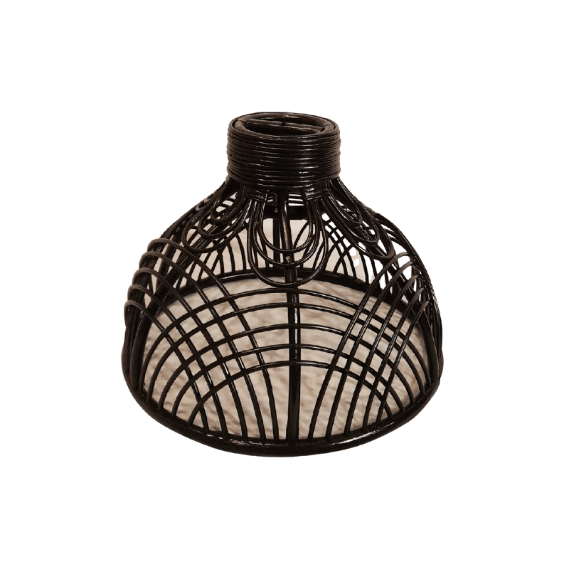Chic black rattan lampshade with elegant curved weaving and looped detailing, ideal for adding a