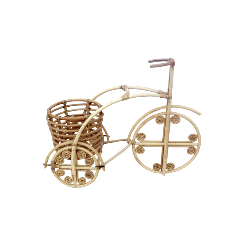 Charming rattan tricycle planter with woven basket, perfect as a decorative holder for plants, flowers,