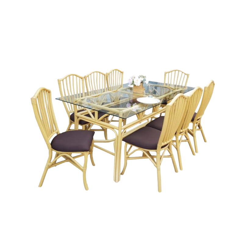 Elegant 8-seater rattan dining set featuring a sturdy rectangular glass tabletop and natural rattan frame.