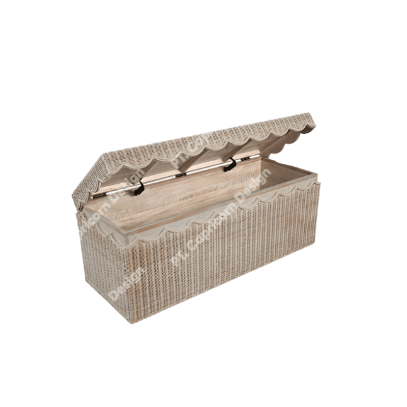 Elegant woven rattan storage trunk with a scalloped lift-up lid and spacious interior, ideal for